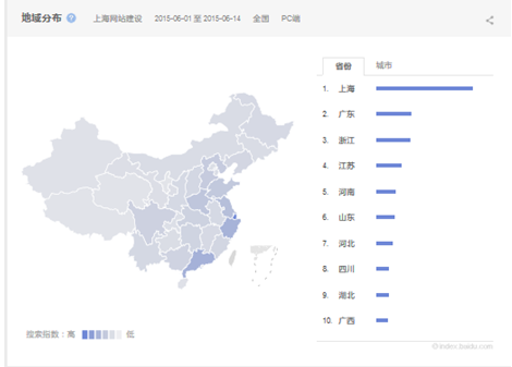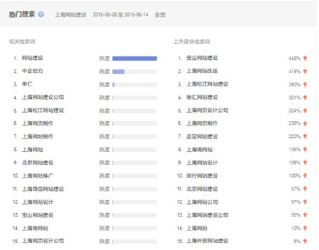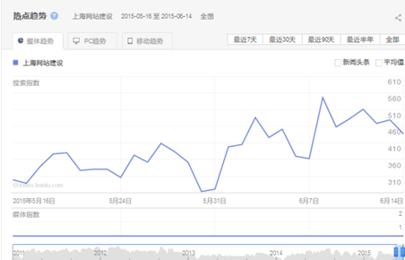 熱點趨勢圖顯示的是上海網站建設在近30天內每天的搜索走勢。2015年6月14日有接近490的搜索指數。